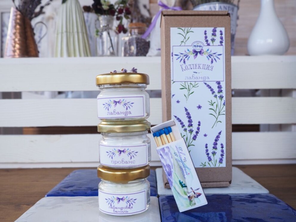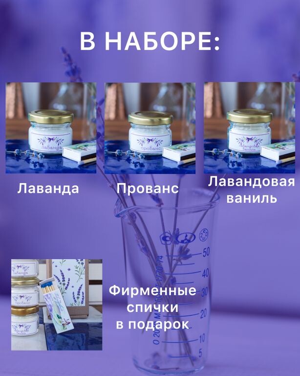 Набор ароматических свечей 3шт. по 20 мл + фирменные спички в подарочной упаковке. Коллекция "Лаванда" 3 аромата «Лаванда», «Прованс», «Лавандовая Ваниль» Идеально сочетаются.