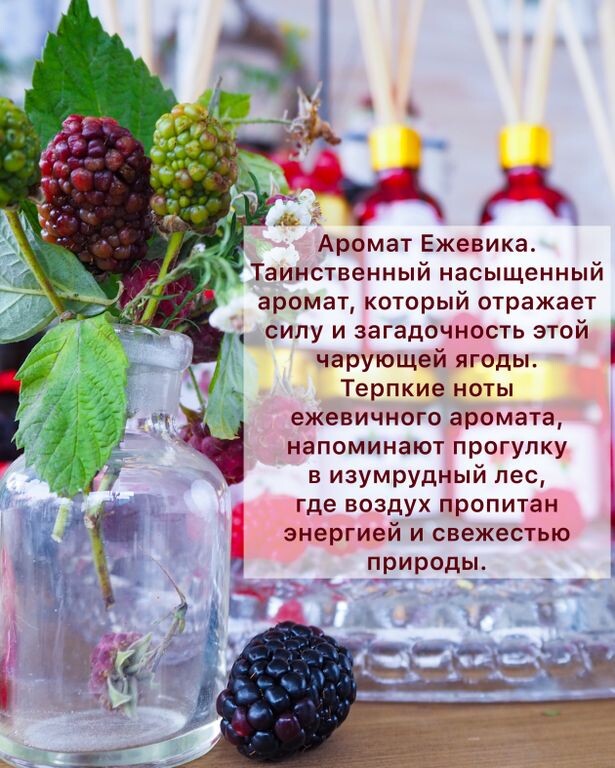 Аромат Ежевика. Таинственный насыщенный аромат, который отражает силу и загадочность этой чарующей ягоды. Терпкие ноты ежевичного аромата, напоминают прогулку в изумрудный лес, где воздух пропитан энергией и свежестью природы.