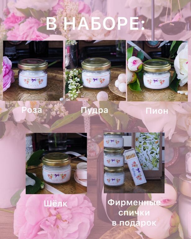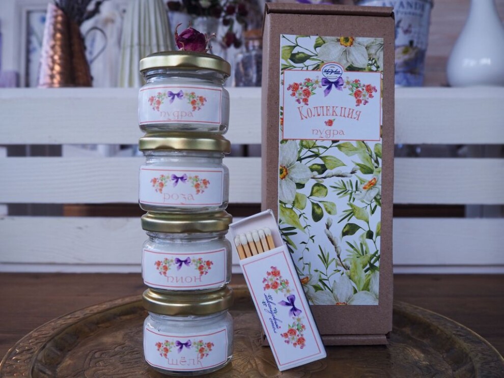 Набор ароматических свечей 3шт. по 20 мл + фирменные спички в подарочной упаковке. Коллекция "Пудра" 4 аромата «Пудра», «Роза», «Пион», «Шёлк». Идеально сочетаются.