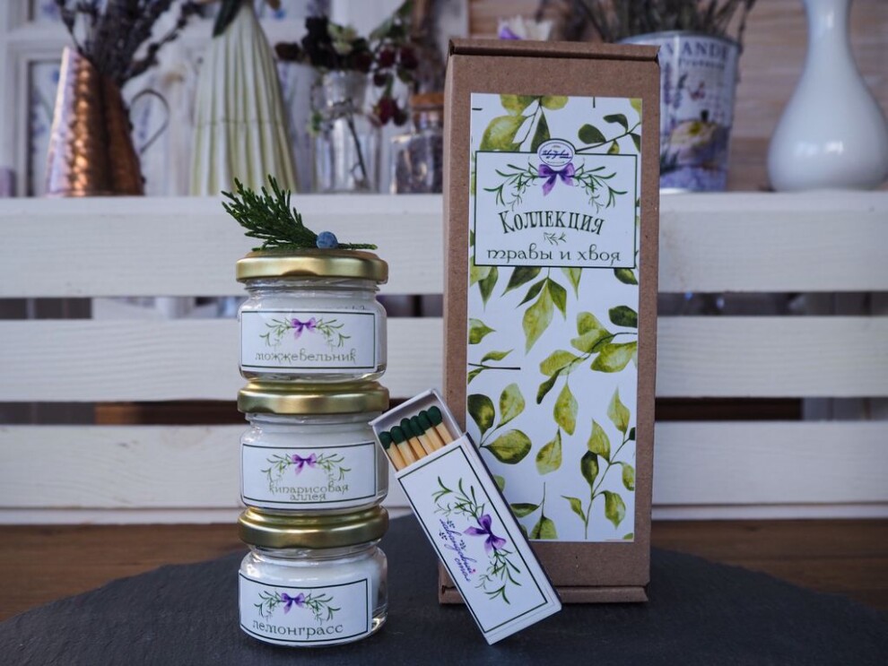 Набор ароматических свечей 3шт. по 20 мл + фирменные спички в подарочной упаковке. Коллекция "Травы и Хвоя" 3 аромата «Лемонграсс», «Кипарисовая аллея», «Можжевельник» Идеально сочетаются.